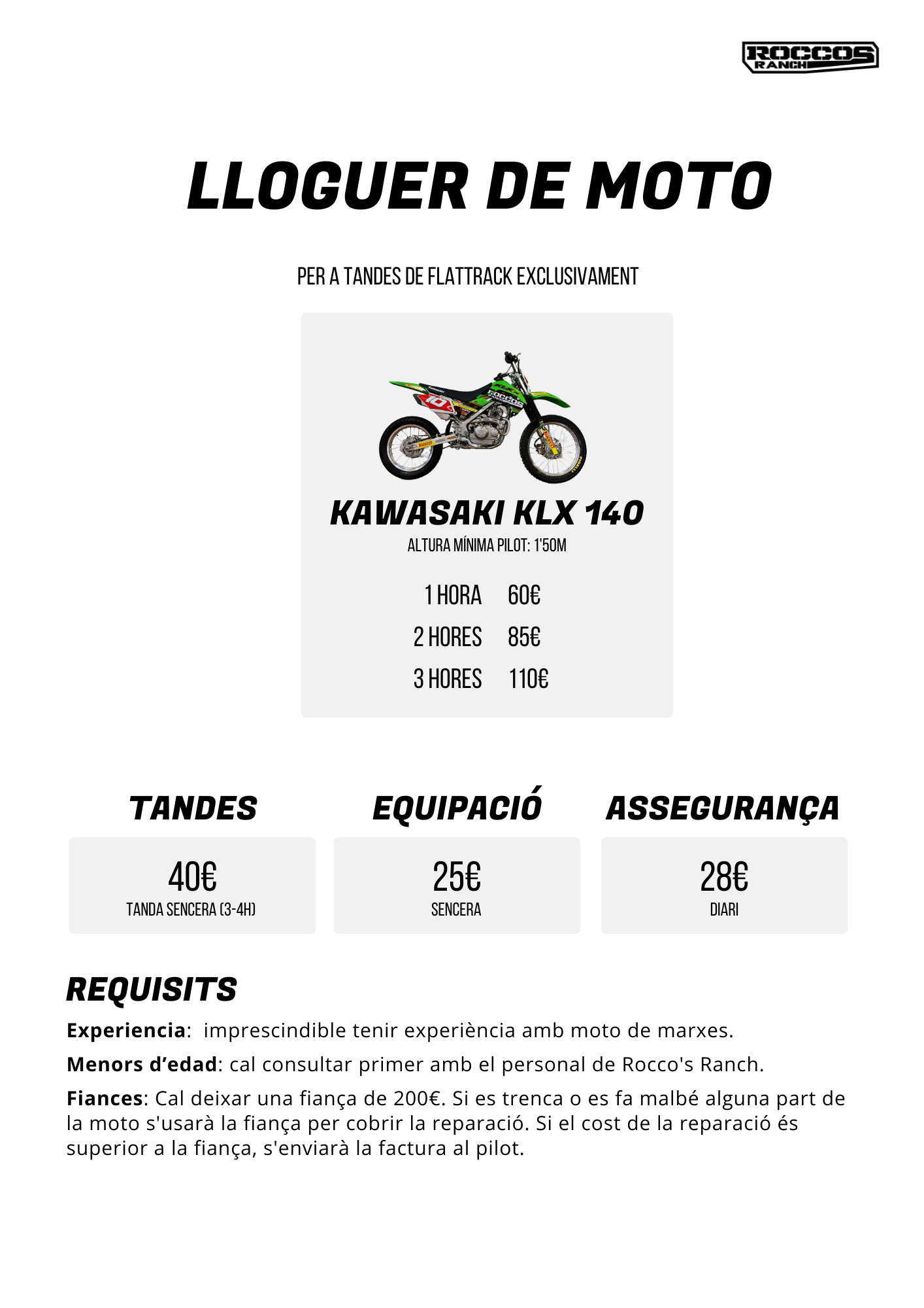 LLOGUER MOTOS PER TANDES A ROCCO'SRANCH - Kawasaki 140cc